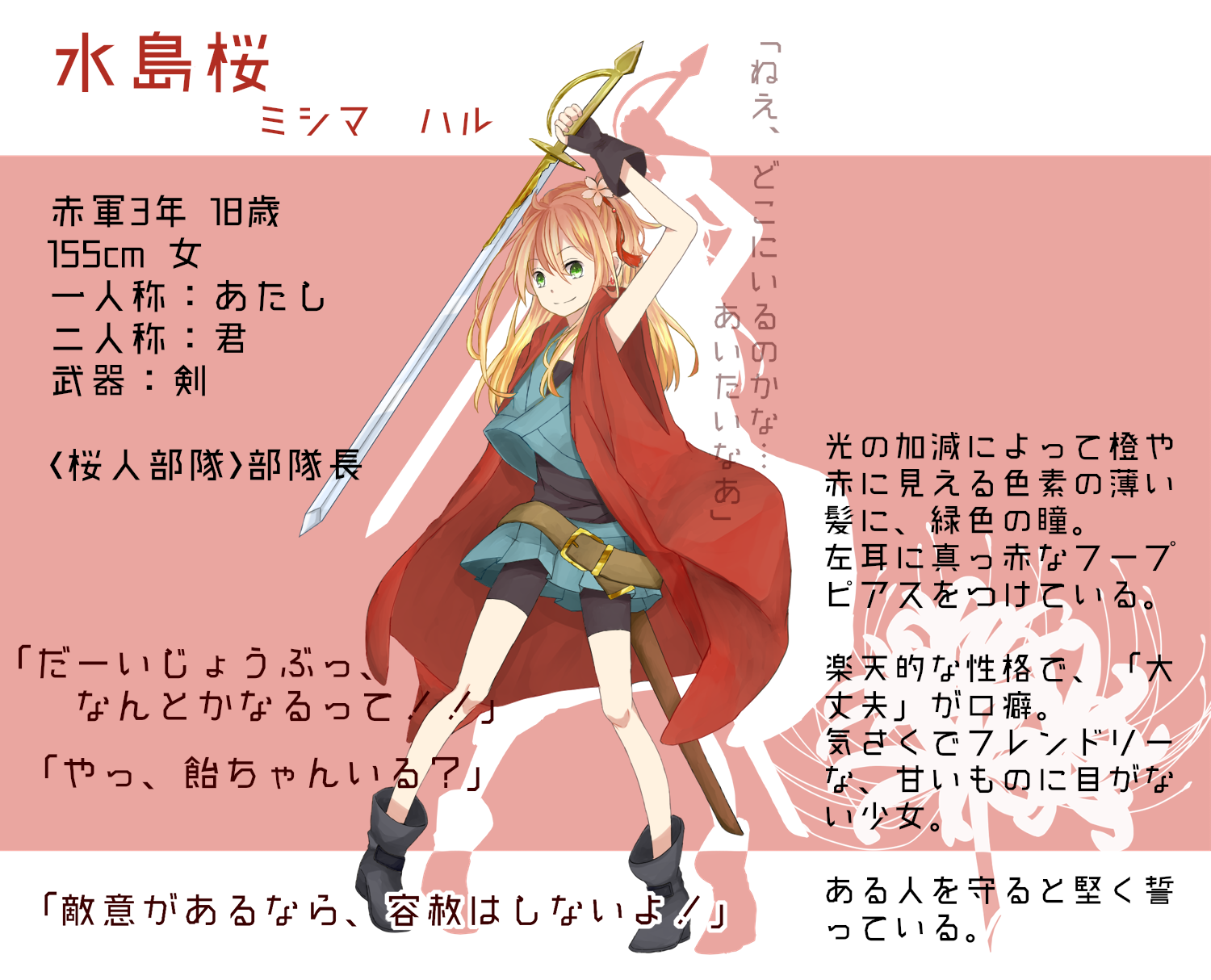 赤軍に所属する3年生。光の加減で赤にも橙にも見える色素の薄い髪に、緑の瞳を持つ。使用武器は剣。