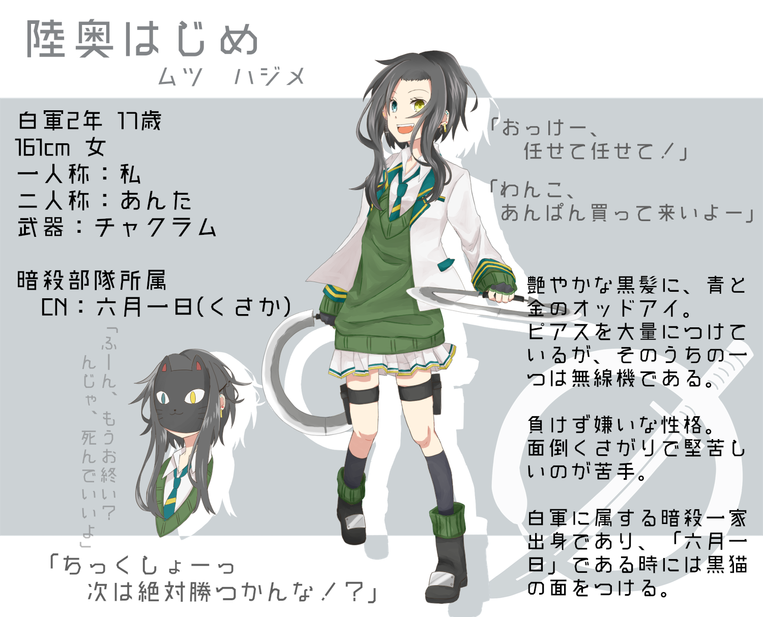 白軍に所属する2年生。艶やかな黒髪に、右目青、左目金のオッドアイの瞳を持つ。使用武器はチャクラム。