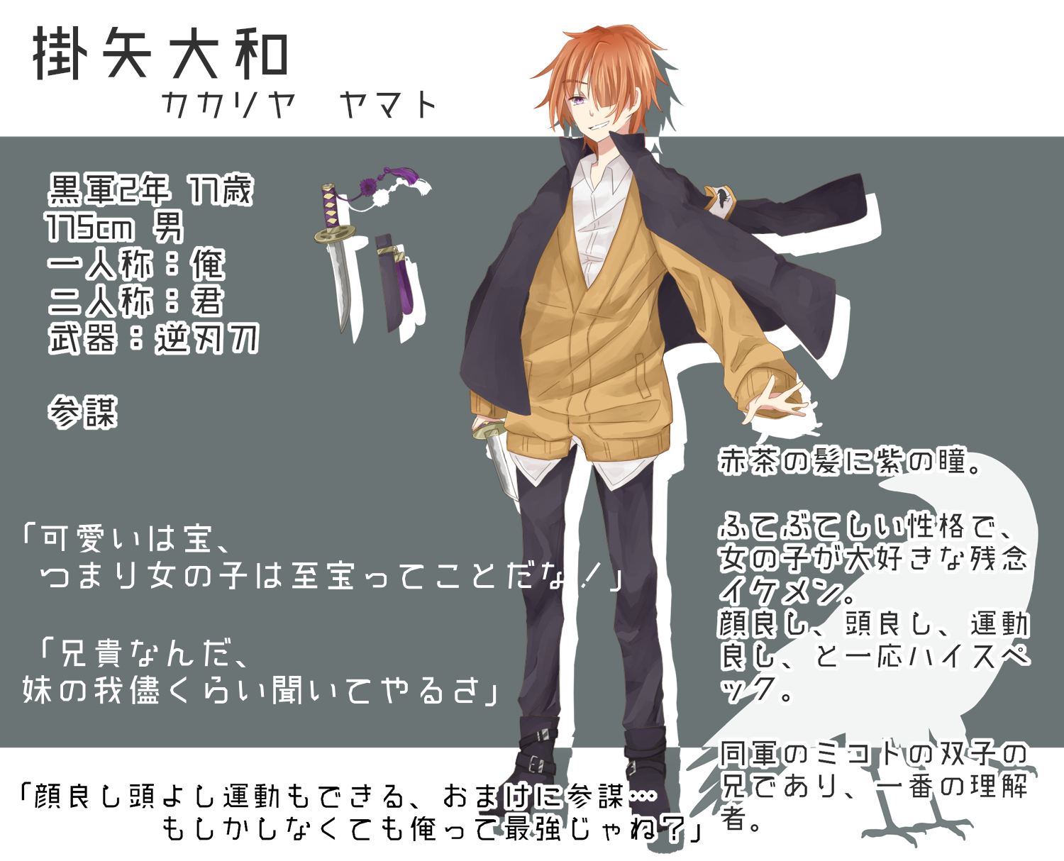 黒軍に所属する2年生。赤茶の髪に、紫の瞳を持つ。使用武器は逆刃刀。
