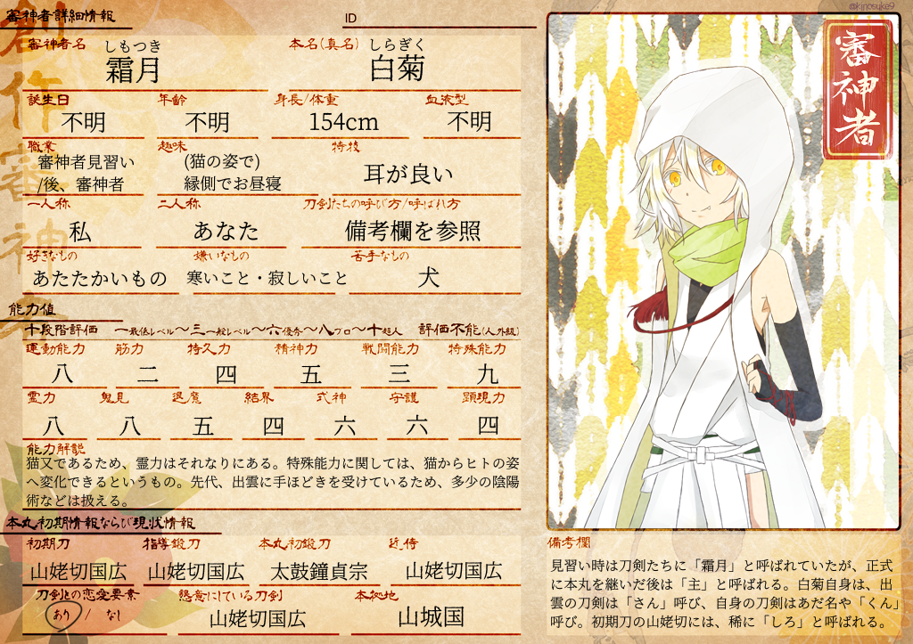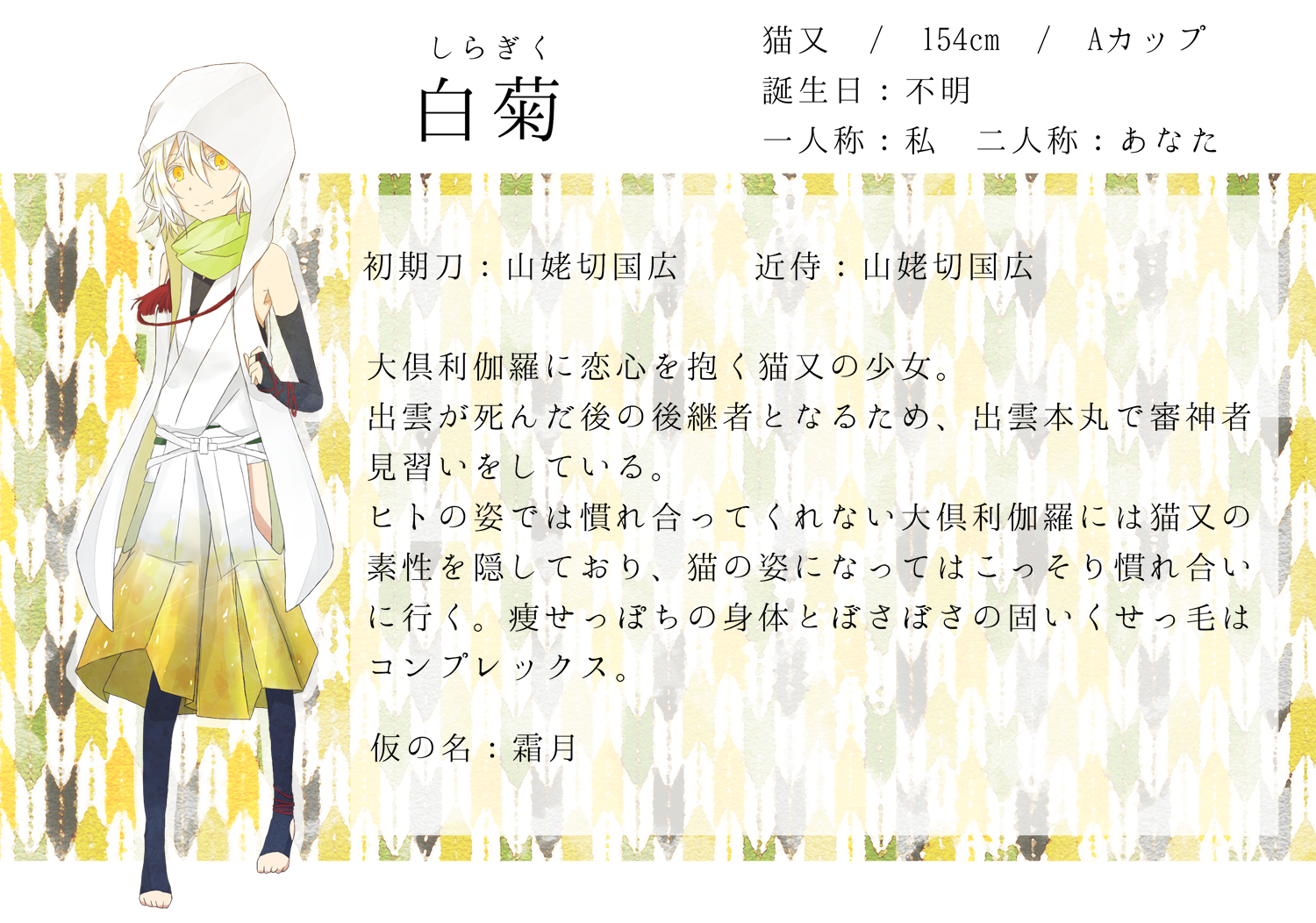 鎌倉時代、まだただの子猫だった頃。死にかけていたところを、遠征でその地を訪れていた大倶利伽羅に救われる。大倶利伽羅と別れた数か月後結局死んでしまったが、また大倶利伽羅に会いたいという想いから、死後は猫又となった。自分を救ってくれた大倶利伽羅をずっと探している。