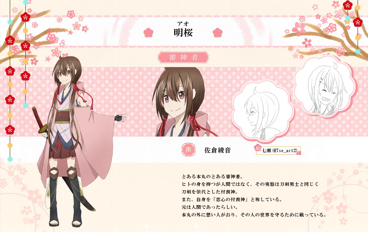 アオの形をもった恋心の亡霊(以下明桜)は、やがて違う世界軸の時の政府に見つかり、「アオ」であったときに斬魄刀を扱っていたなどの経緯から、時間遡行軍を討伐する審神者就任の要請を受ける。時間遡行軍が歴史を改変することにより、他時空にも影響が及ぼされ、サトシの生きるポケモン世界の根底も危ぶまれる可能性があるということを示唆された明桜は、政府の要請に承諾し、加州清光を初期刀として審神者となった。審神者として名乗る仮の名は「残花」。散り残った、桜の花。